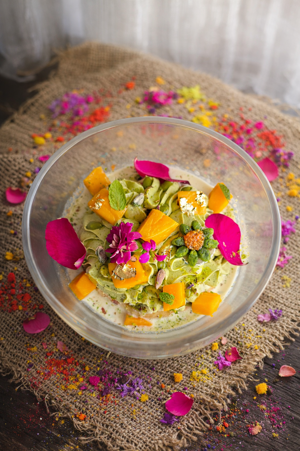 Topped with ribbons of pistachio cream, Alphonso mango chunks, fresh mint, rose petals, and floral pistachio accents : Every spoonful is creamy, nutty, floral, fresh and beautifully balanced.